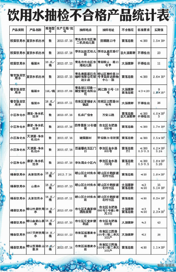 “桶裝飲用水抽檢24批次,涉及青龍、娃哈哈、塘子觀、冰露、嶗井、青啤、仰口、嶗山、至純、太清、嶗竹、嶗山金韻、九水·明漪、嶗山玉源泉等14個商標(biāo)品牌或廠家,采樣地點主要來自于市南、市北、李滄、嶗山等地供水站?!笔惺嘲厕k應(yīng)急管理處處長匡雷說,根據(jù)產(chǎn)品類別不同,分別依據(jù)《GB19298-2003瓶(桶)裝飲用水衛(wèi)生標(biāo)準(zhǔn)》、《GB8537-2008飲用天然礦泉水》和《GB17323-1998瓶裝飲用純凈水》三個標(biāo)準(zhǔn),檢驗項目設(shè)定了大腸菌群 、菌落總數(shù)、霉菌、酵母、三氯甲烷、溴酸鹽、總砷、銅、鎘、鉛共10余個項目,其中合格17批次,不合格7批次,合格率為70.83%。不合格產(chǎn)品中 5個批次菌落總數(shù)超標(biāo),4個批次大腸菌群超標(biāo)。